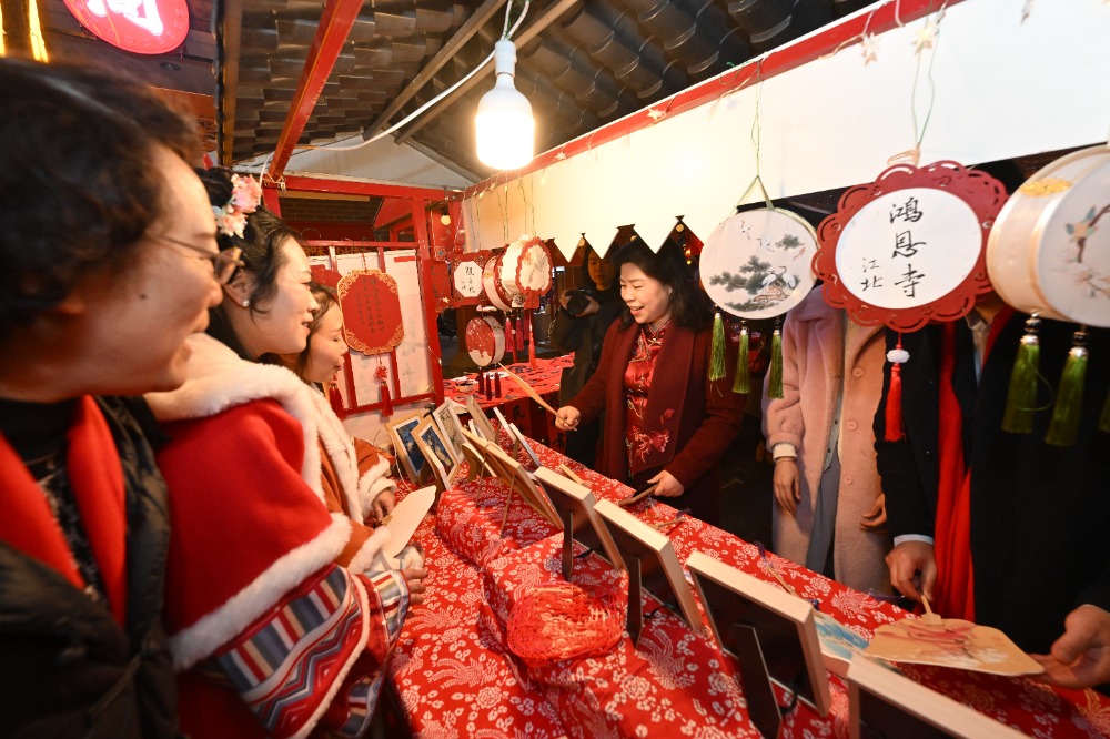 徜徉“渝味360碗”美食街区,一侧是热气腾腾的特色美食,另一侧是国潮年货集市。记者在现场看到,集市花车上的春联福字、国画书法、江北剪纸、冰糖葫芦、火锅底料等商品让人眼花缭乱,引发市民游客的竞相选购。