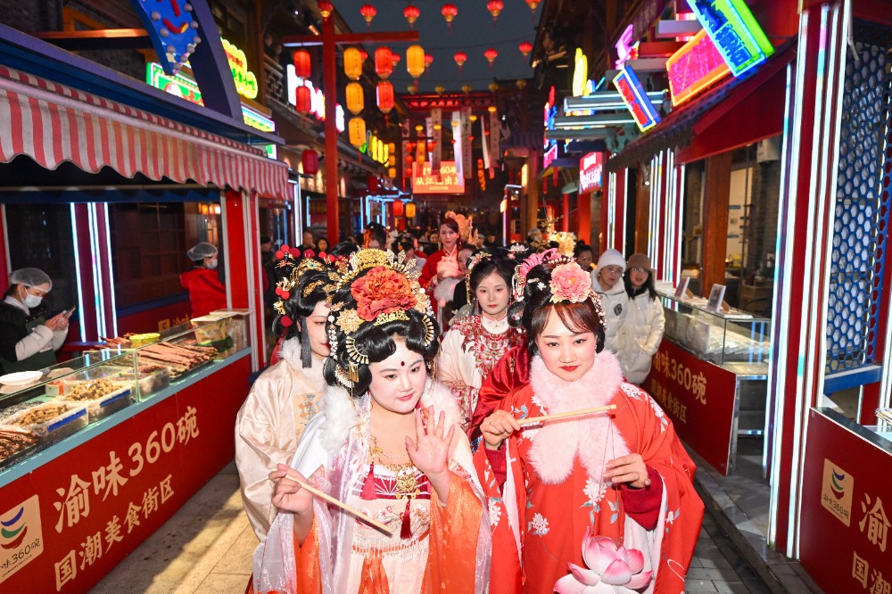 ▲1月23日晚,江北区鸿恩坊“渝味360碗”美食街区,汉服巡演。记者 刘力 摄/视觉重庆