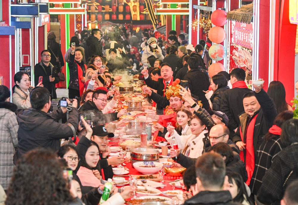▲1月23日晚,江北区鸿恩坊“渝味360碗”美食街区 ,市民和外国友人一起入席品尝“渝味360碗”长桌宴。记者 刘力 摄/视觉重庆